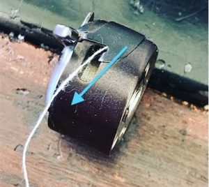 Through this hole (it’s open on one side, just thread the thread through and push).